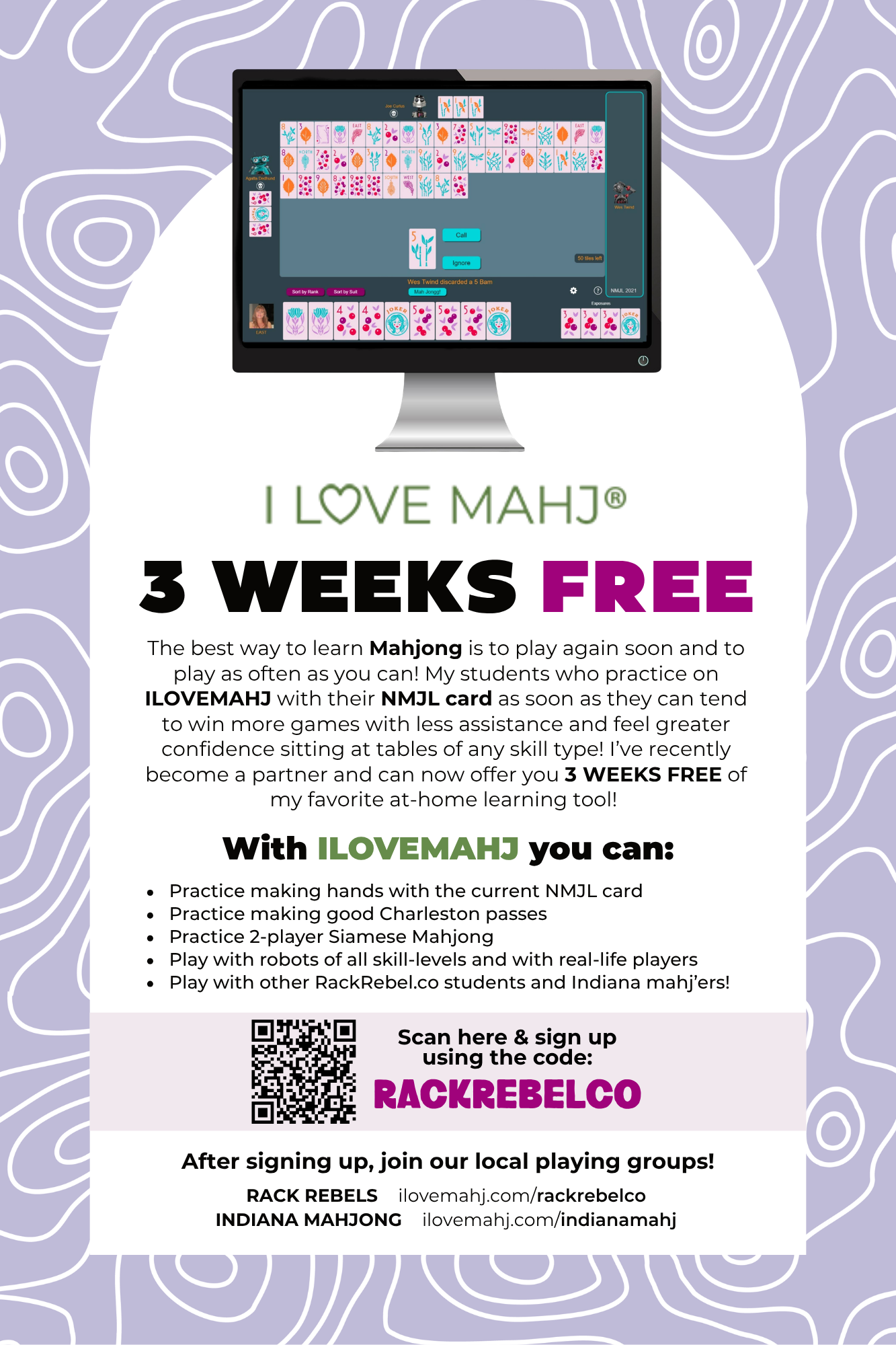 The best way to learn Mahjong is to play again soon, and play as often as you can. My favorite way to do this is online! Use the code RACKREBELCO to get 3 weeks for free!